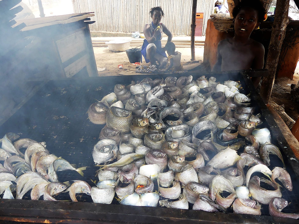 Les hommes pêchent tous les jours pour un maigre butin, le poisson n'est plus aussi abondant qu'auparavant. Les femmes s'occupent de la transformation du poisson. Elles les écaillent, les vident et les fument aussi, c'est la spécialité locale. Le fumage se fait au feu de bois ou avec les coques séchées des noix de coco. Les poissons sont roulés et disposés sur une grille au dessus du feu, ils seront vendus sur les marchés de la région.