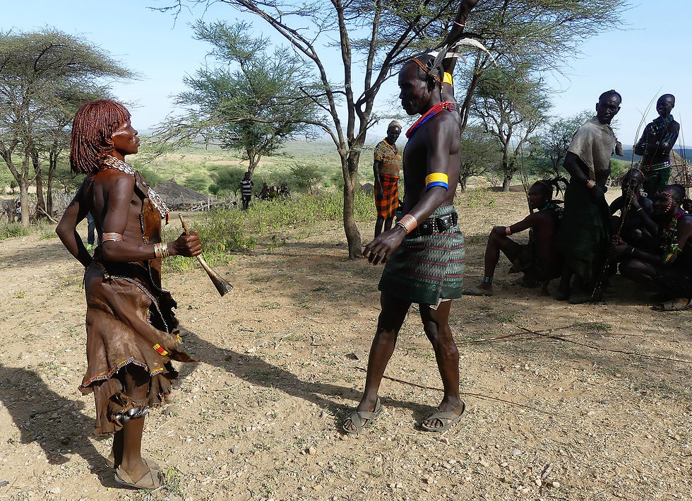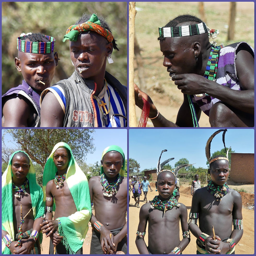 Les jeunes hommes du village se sont préparés longuement en peignant de beaux motifs sur leurs visages et en se parant de superbes colliers de perles multicolores, un serre-tête orné de plumes sur la tête. Certains se sont plus simplement enduits le corps d'huile. Ils sont équipés de fines branches souples prêtes à servir, sans pitié.