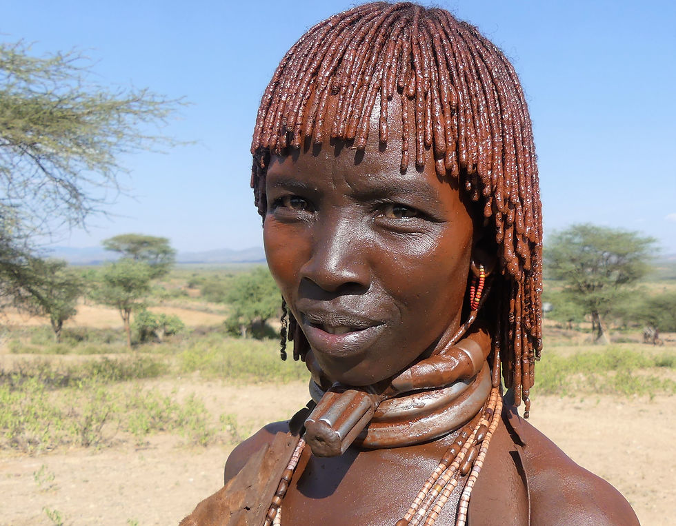 Les femmes s'enduisent les cheveux d'argile et de beurre, leur donnant une teinte cuivrée qui brille au soleil. On ne peut pas faire plus gras...Ils sont ensuite tressés, l'opération est renouvelée chaque semaine. Certaines portent une calebasse sur la tête pour se protéger du soleil, ce n'est pas fait pour séduire.