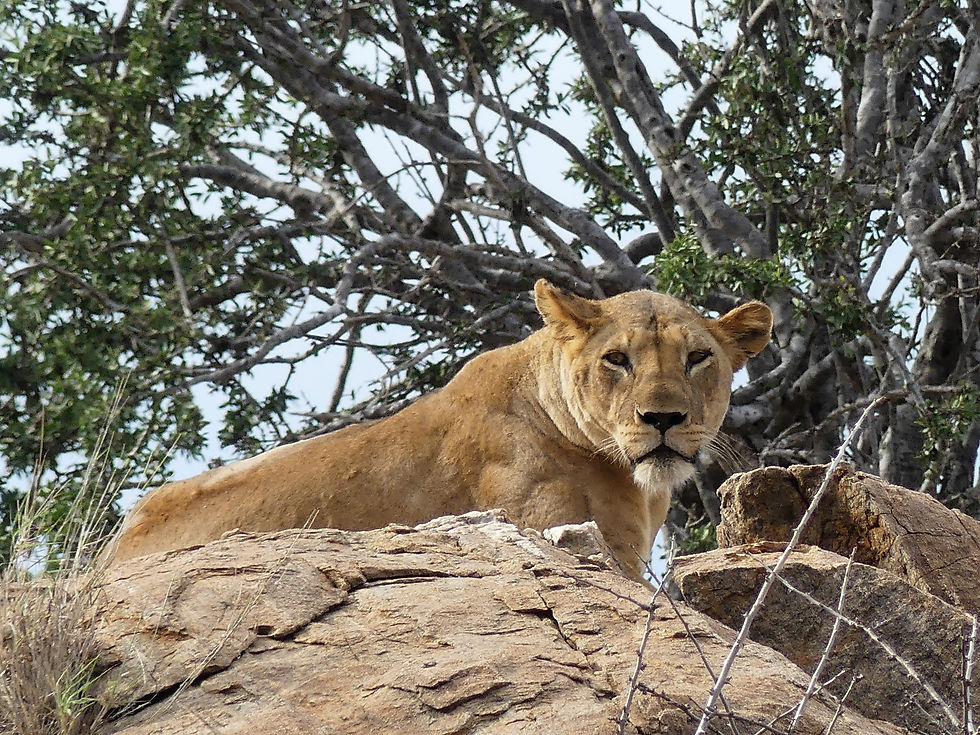 En effet, une très belle lionne se reposait au sommet d'un amas rocheux. Je ne la voyais pas très bien, elle était malheureusement un peu loin. Il fallait les jumelles. Mais, comme on dit, rien que de l'avoir vue, j'ai gagné ma journée. C'était la fin de l'après-midi, on décide de rejoindre le lodge.