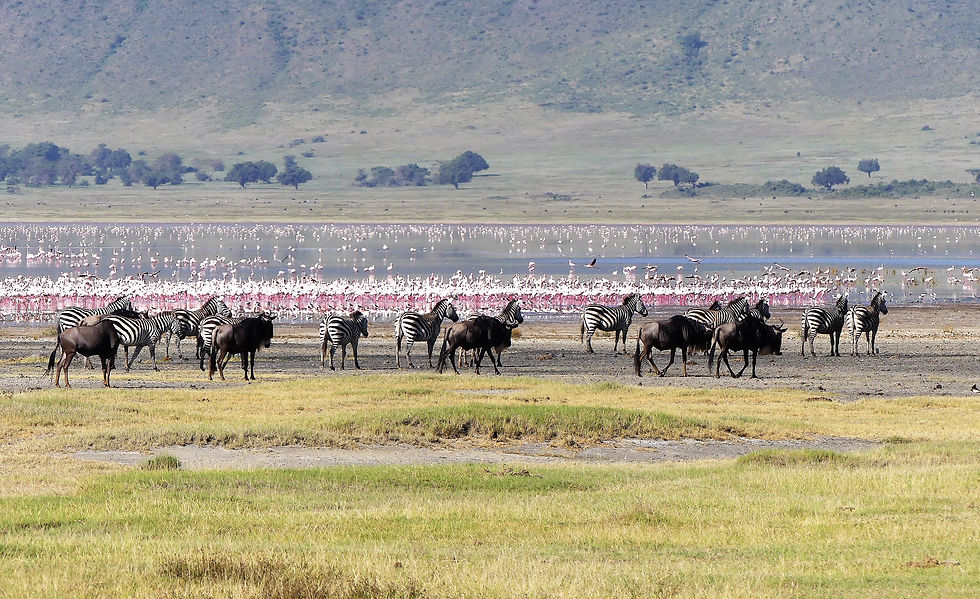 On peut s'approcher du lac Magadi avec le véhicule, on aperçoit alors des centaines de flamands roses en arrière-plan des autres animaux qui viennent s'y rafraîchir. C'est un tableau paradisiaque !